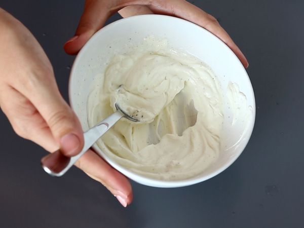 Sekoita joukkoon tuorejuusto, sitruunamehu, suola ja pippuri. Leikkaa lohipihvi pieniksi paloiksi.