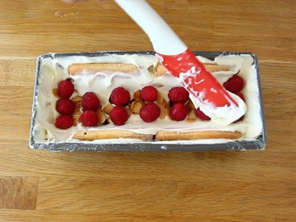Peitä boudoirit kermalla ja ripottele päälle paahdettuja manteleita. Aseta vadelmat päälle ja peitä kermalla.