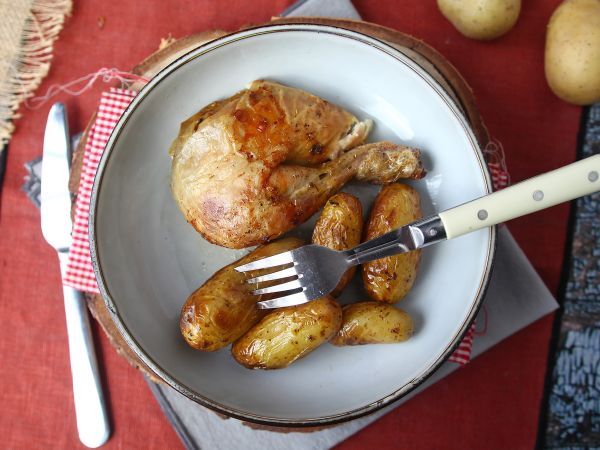 Paista 180 °C:ssa 1 tunti "Paista/Paista"-tilassa, käännä puolivälissä paistamista (voit lisätä joukkoon pommes grenaillea, kuten me).