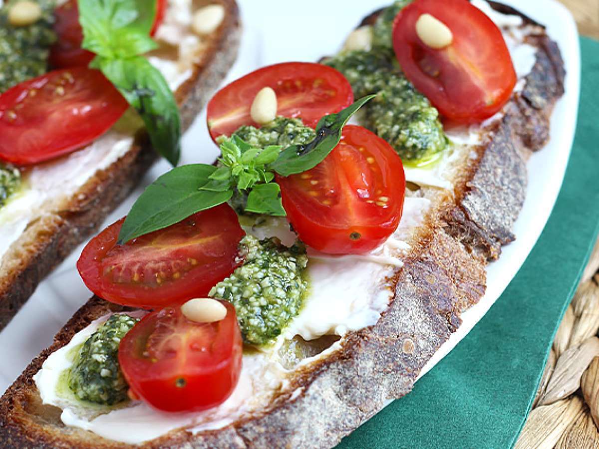 Eikö ruokahalu ole kovin suuri tässä helteessä? Tässä on nopea, raikas ja maukas resepti vatsan rauhoittamiseksi: tartines! Tässä yhdistelmässä ranskankermajuuston, pestokastikkeen ja kirsikkatomaattien yhdistelmä sopii erinomaisesti naposteltavaksi sellaisenaan tai sekasalaatin kanssa. Nauti!